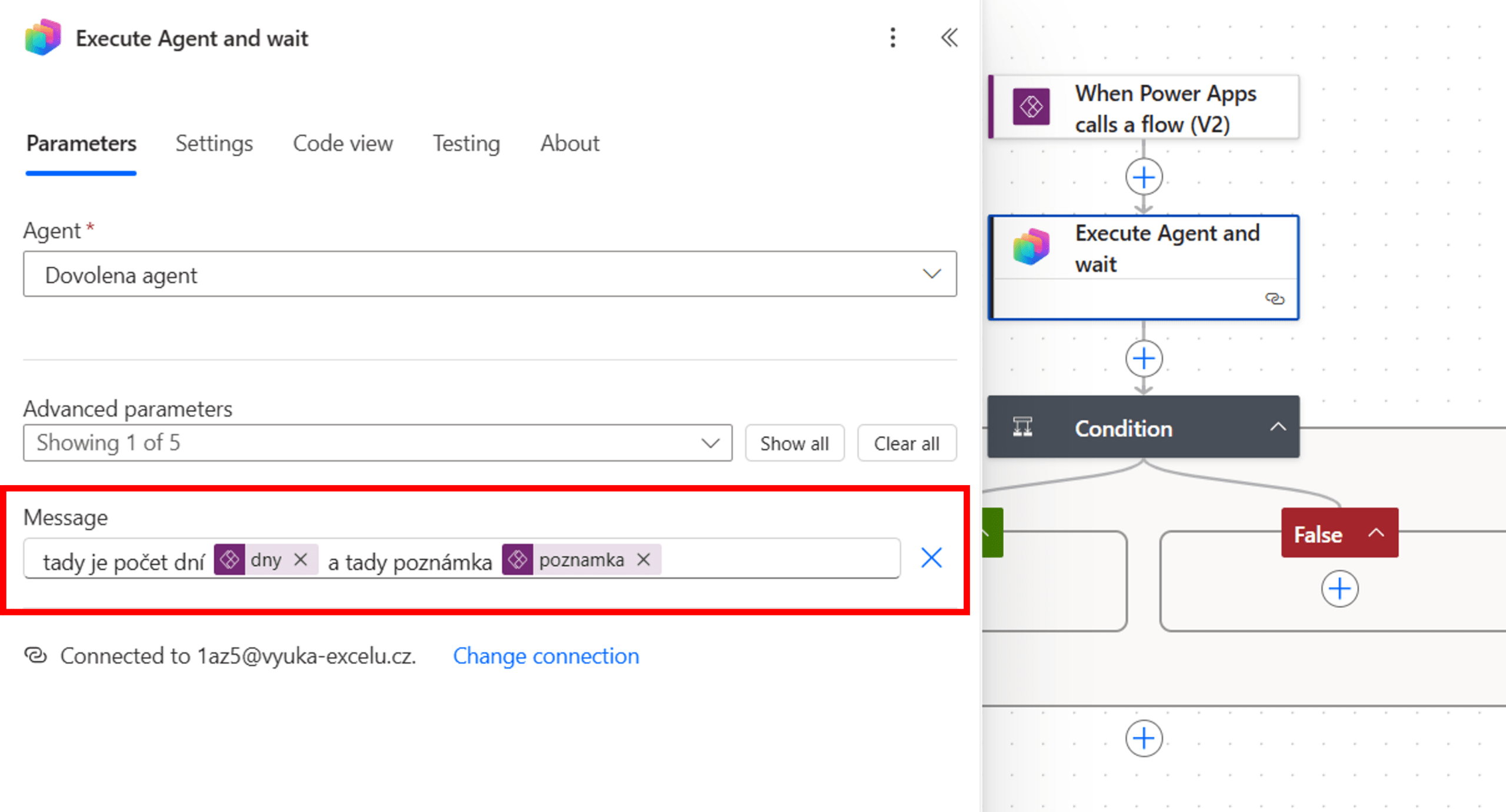 V Power Automate tohoto agenta zavoláme a vložíme mu parametry.