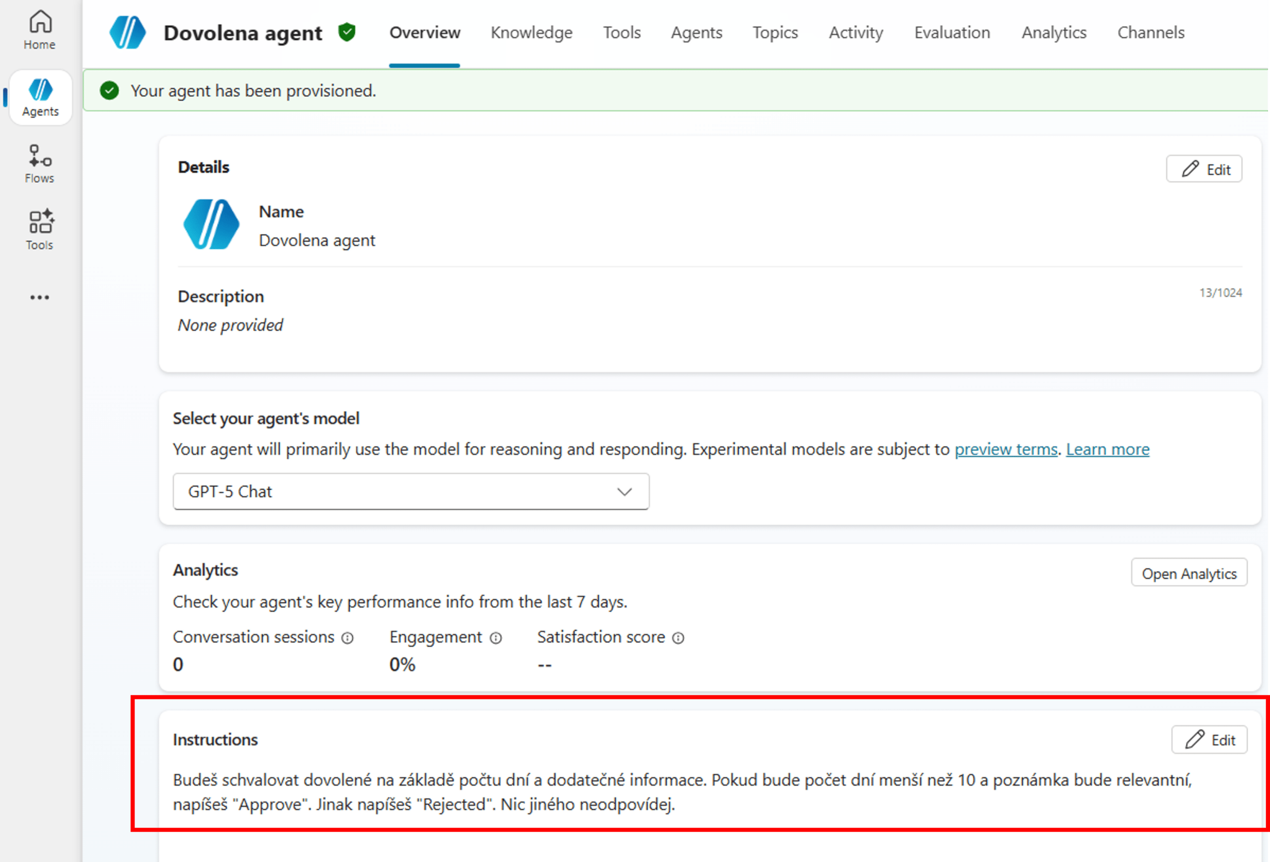 Potřebujeme agenta s popisem chování. Analogicky byste mohli použít komponentu AI Hubu.