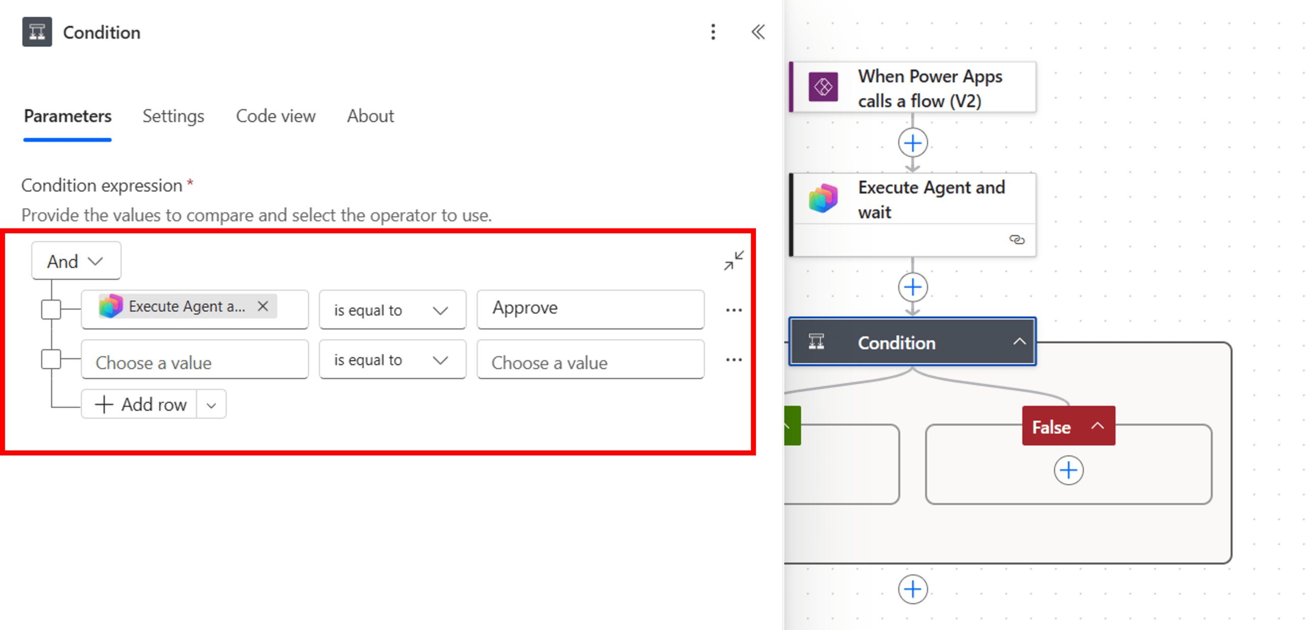 Pak vložíme rozhodovací podmínku, která zareaguje na výsledek agenta. Od teď se flow vydá směrem, který bude záviset na rozhodnutí agenta.