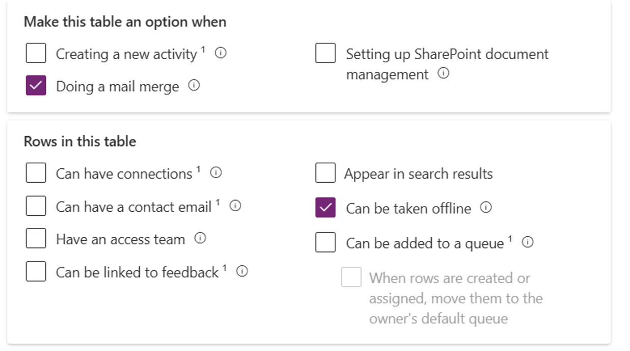 • Nastavit nebo zkontrolovat nastavení na úrovni tabulky Dataverse